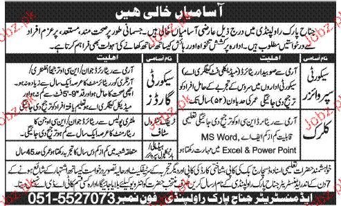 Clerks, Security Supervisors and Security Guards are required in Jinnah Park in Rawalpindi