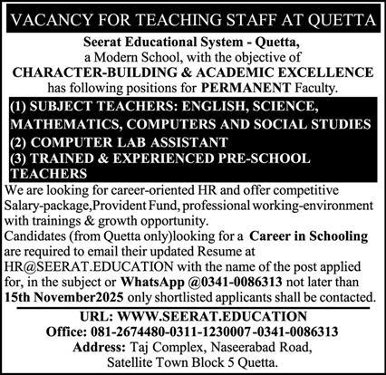 Seerat Educational System invites applications for job positions advertised in daily Express Tribune dated 4 November 2025 for following vacancies in Satellite Town Quetta, quetta Balochistan Pakistan.