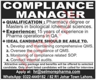 Selmore Pharmaceuticals Pvt Limited Lahore, lahore Punjab Pakistan invites applications from eligible candidates for the post of compliance manager as per advertisement of July 28, 2024 published in daily Jang Newspaper. Master, MS and Bachelor etc. educational qualification will be preferred.