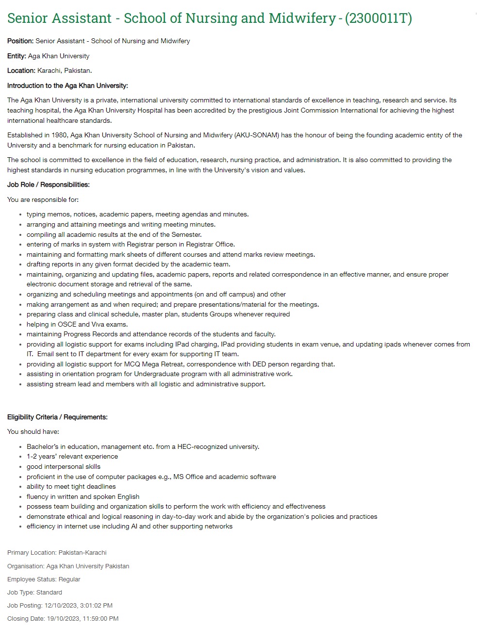 Aga Khan University latest Private Medical jobs and others can be applied till 19 October 2023 or as per closing date in newspaper ad. Read complete ad online to know how to apply on latest Aga Khan University job opportunities. Learn today extra skills including Computer Support, English (UK) and MS Office to get these Aga Khan University jobs.