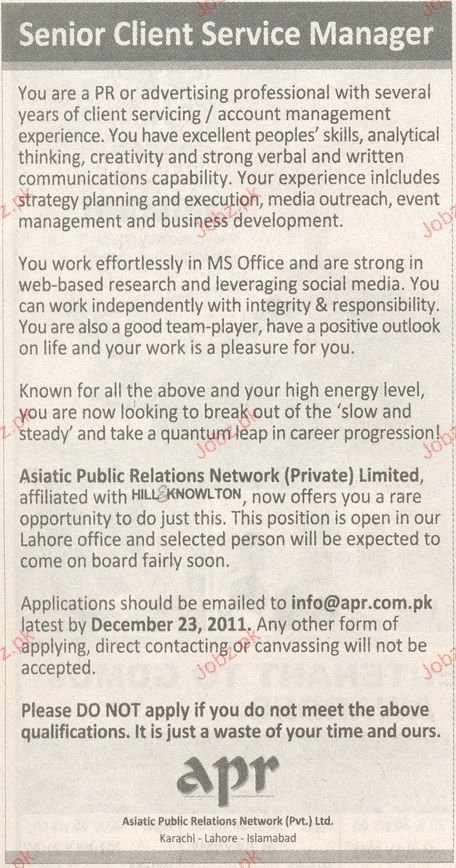 Apply as per details in job advertisement. Login to view further details of how to apply via https://www.jobz.pk online.