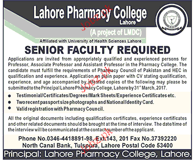 Senior Faculty Job In Lahore Pharmacy College