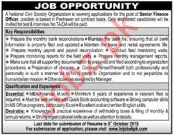 Senior Finance Officer NGO Jobs 2018 In Peshawar