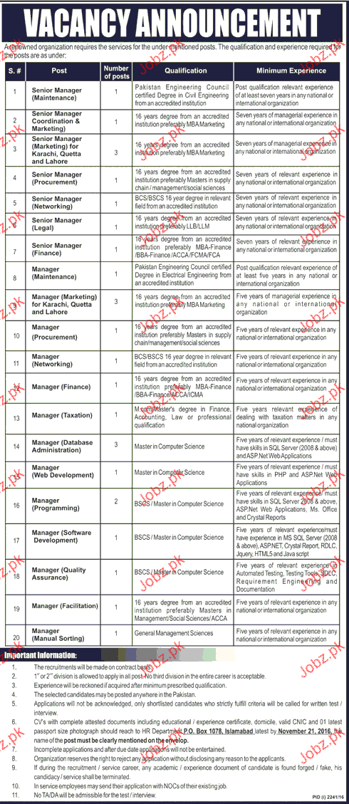 Apply as per details in job advertisement. Login to view further details of how to apply via https://www.jobz.pk online.