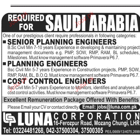 Senior Planning Engineers, Planning Engineers and Cost Control Engineers are required in Saudi Arabia