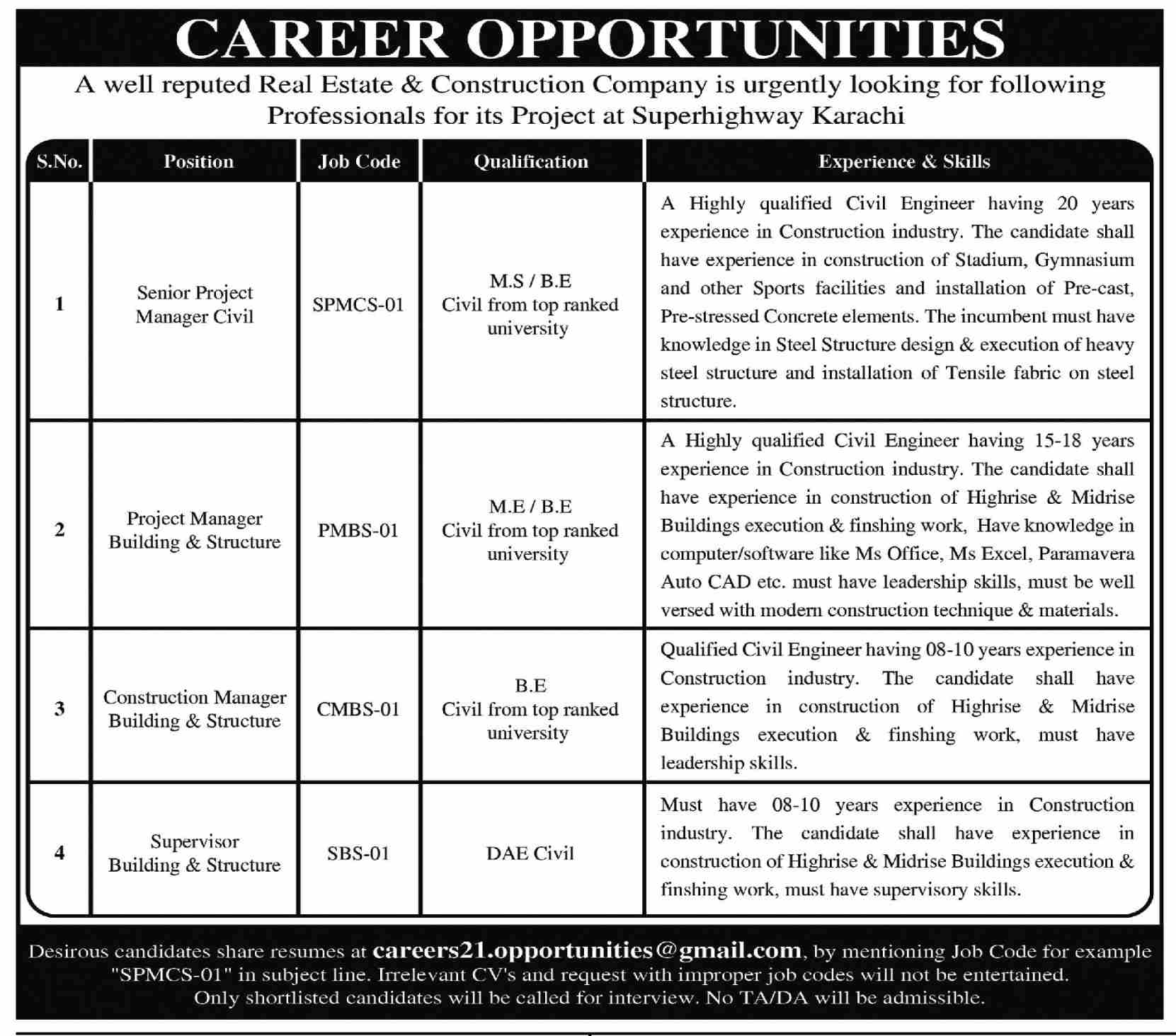 A well progressive Real Estate Company located in Karachi is seeking for the services from experienced candidates for the posts of Project Manager, Senior Project Manager Civil Project Manager Building, Construction Manager Building, Construction Manager Structure, Supervisor Building, Supervisor Structure.