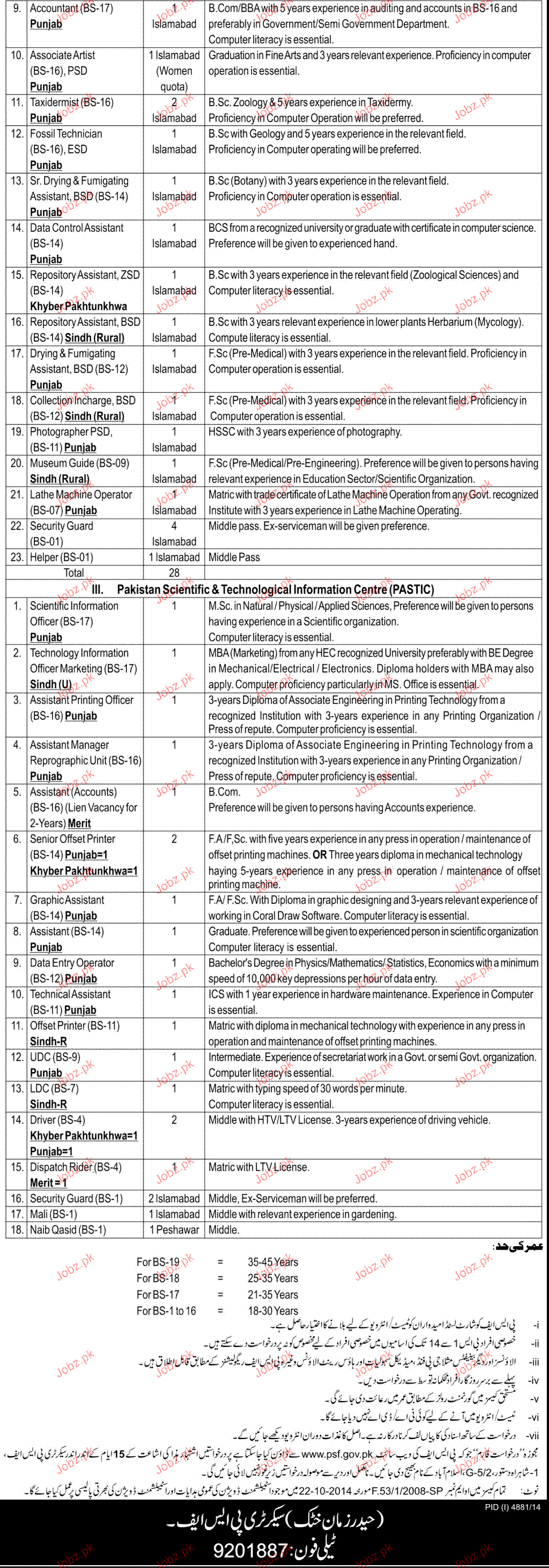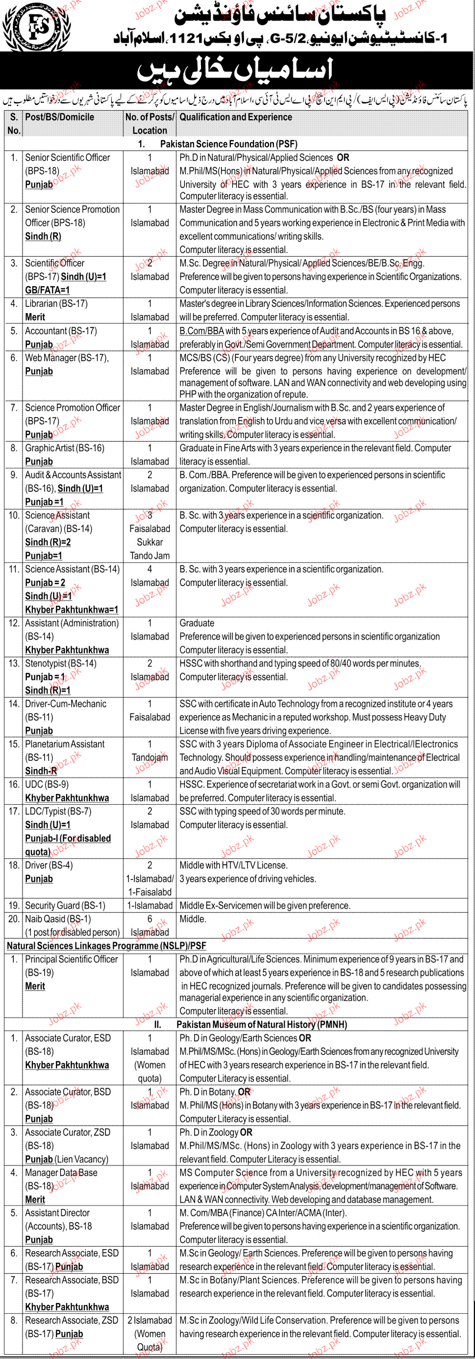 Senior Scientific Officers, Scientific Officer, Librarian, Accountant, Web Managers, Assistant Administrators, Driver Cum Mechanics, UDC, Assistant Directors, Research Associates and Data Control Assistants are required in Pakistan Science Foundation in Islamabad.