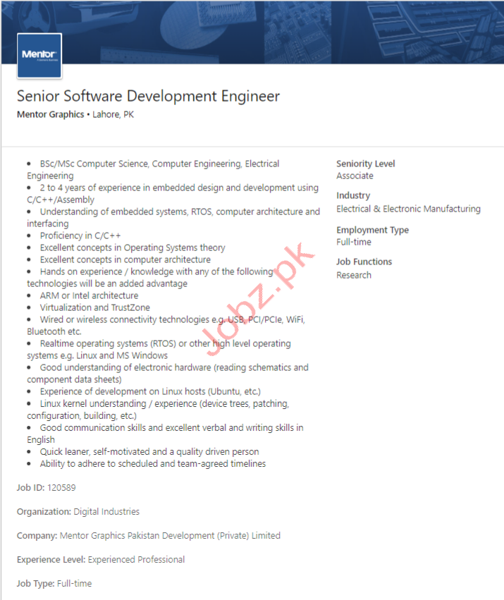 Latest Mentor Graphics Pakistan Development Pvt Ltd IT Posts Lahore 2025
