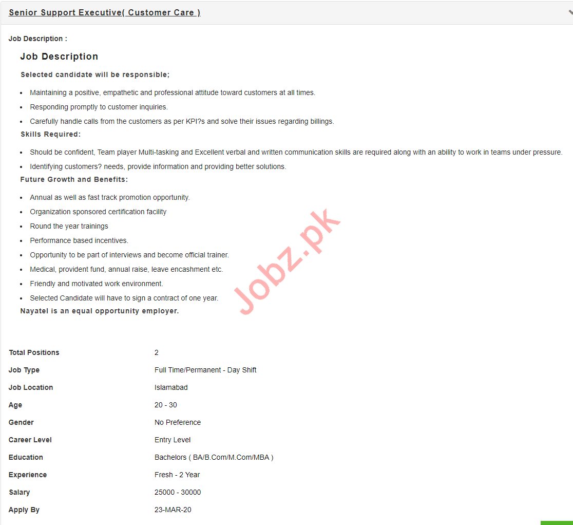 Apply as per details in job advertisement. Login to view further details of how to apply via https://www.jobz.pk online.