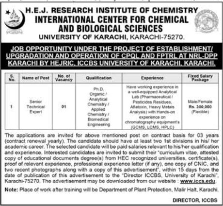HEJ Research Institute of Chemistry Karachi, karachi Sindh Pakistan invites applications from eligible candidates for the post of sr technical expert as per advertisement of August 3, 2025 published in daily Jang Newspaper. Persons with Phd etc. education can apply.