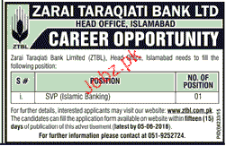 Senior Vice President is required in Zari Taraqati Bank in Islamabad.