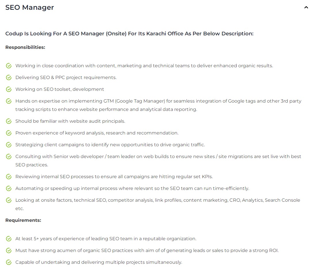 Vacant posts including seo manager are announced in Codup Software Company Karachi, karachi Sindh Pakistan as per 16 November 2023 advertisement in daily Other Newspaper. Candidates with Master and Bachelor etc. educational background will be preferred.