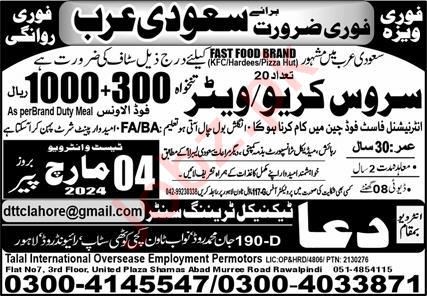 Service Crew And Waiter Jobs In Saudi Arabia