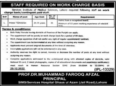 ervices Institute of Medical Sciences SIMS Lahore, lahore Punjab Pakistan invites applications from eligible candidates for the post of printer technician as per advertisement of December 24, 2022 published in daily Ausaf Newspaper. Persons with Matric etc. education can apply.