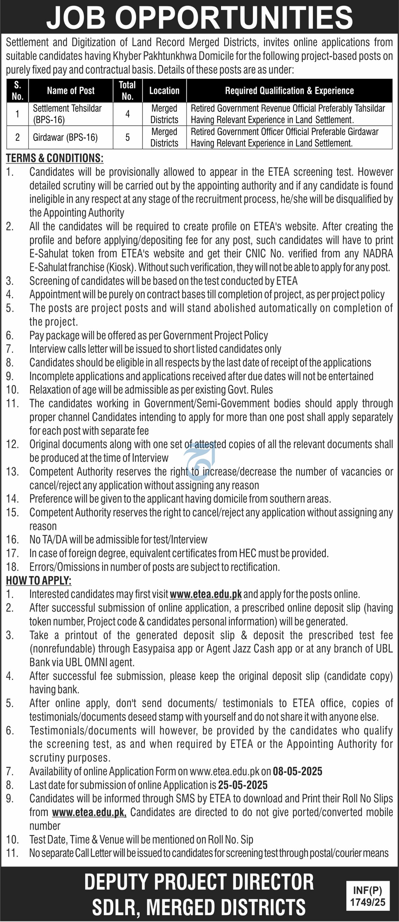 Latest Management jobs and others Government jobs in Settlement of Land Records closing date is around May 25, 2025, see exact from ad. Read complete ad online via ETEA to know how to apply on latest Settlement of Land Records job opportunities.