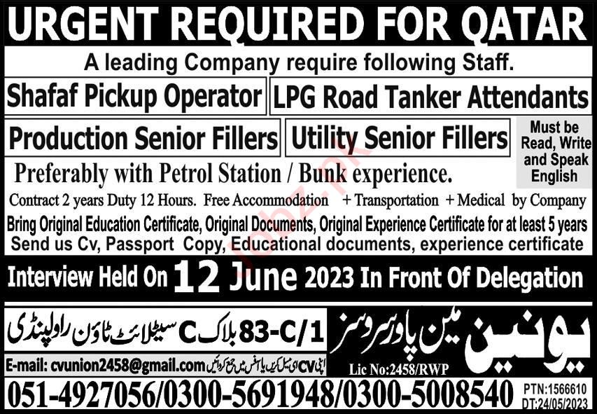 Union Manpower Services jobs advertisement dated about 11 June 2023 in daily Express Newspaper invites application for the vacant post of shafaf pickup operator, lpg road tanker attendants, production fillers and utility fillers in Qatar, qatar Qatar. Persons with Intermediate, Bachelor and Matric etc. education can apply.
