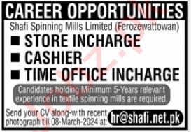 Shafi Spinning Mills Limited jobs advertisement dated about 3 March 2024 in daily Jang Newspaper invites application for the vacant post of cashier, time office incharge and store incharge in Lahore, lahore Punjab Pakistan. Persons with Intermediate and Matric etc. education can apply.