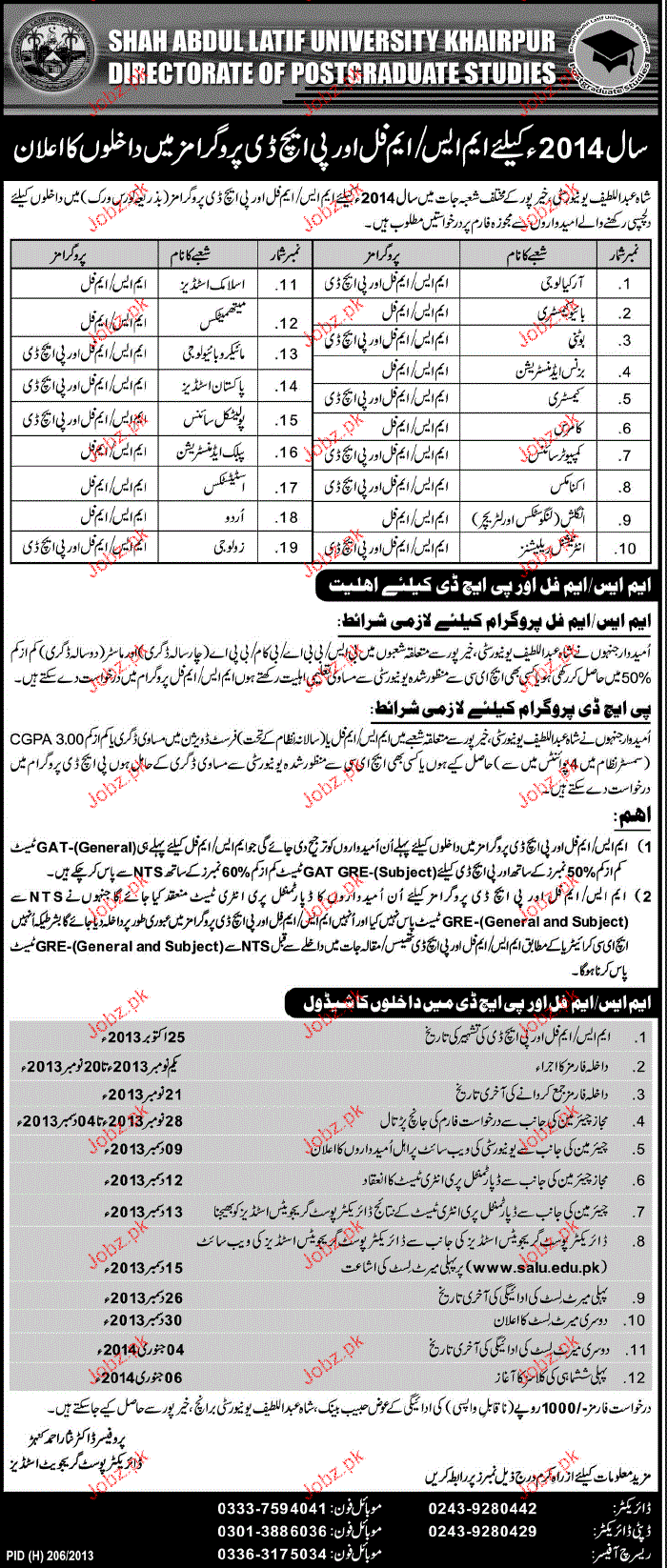 Shah Abdul Latif University Admission in MS, Mphill and Phd in Khairpur Read newspaper ad for exact details.