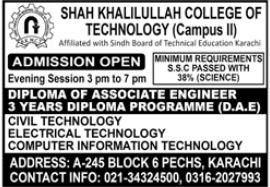 Shah Khalilullah College of Technology affiliated with Sindh Board of Technical Education Karachi is offering admissions for Diploma of Associate Engineering DAE in Civil Technology, Electrical Technology & Computer Information Technology. Read newspaper ad for exact details.