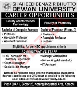 Vacancies in Shaheed Benazir Bhutto Dewan University Advertisement November 2023