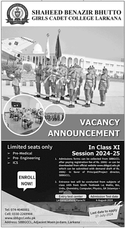 Shaheed Benazir Bhutto Girls Cadet College admissions 2024 for Pre Medical, Pre Engineering has been announced. Eligible students who qualify as per admission criteria in Shaheed Benazir Bhutto Girls Cadet College Larkana Sindh Pakistan can apply in Teaching College for academic year 2024. Eligible students for fulfilling criteria for admissions in Intermediate and ICS can enroll as per Government admission policy 2024 till closing date 27 July 2024. Read newspaper ad for exact details.