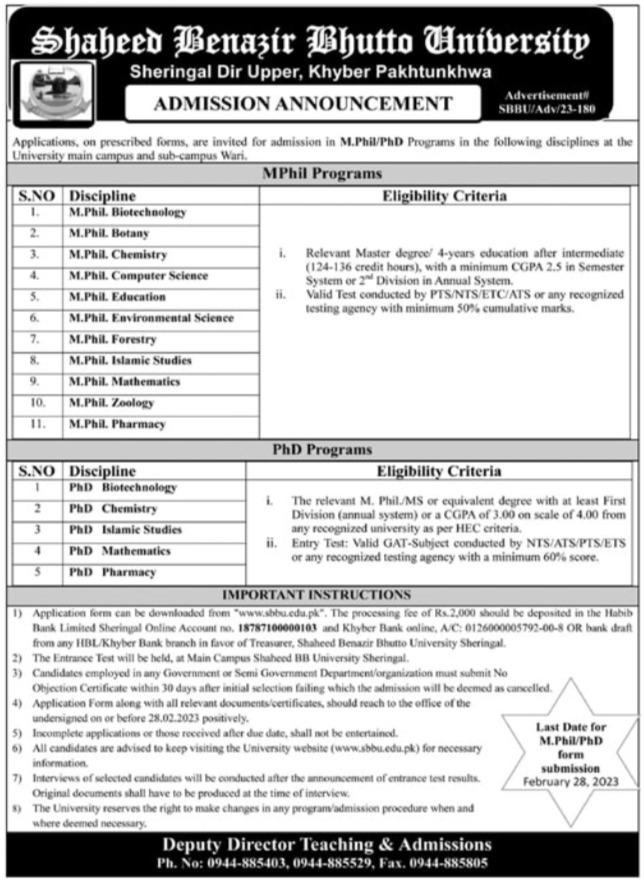 Shaheed Benazir Bhutto University admissions 2023 has been started. Eligible students can apply for academic admissions 2023 in Shaheed Benazir Bhutto University Upper Dir Khyber Pakhtunkhwa KPK Pakistan for Science University. Eligible candidates for admissions in Mphil and Phd can apply as per Government institute criteria and before closing date 28 February 2023 after reading advertisement online. Read newspaper ad for exact details.