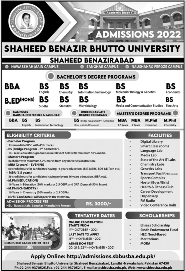 Shaheed Benazir Bhutto University SBBU Nawabshah has announced admissions for Fall 2021 in various graduate and posgraduate programs like BS, BBA, B.Ed MBA and M.Phil Programs. Read newspaper ad for exact details.