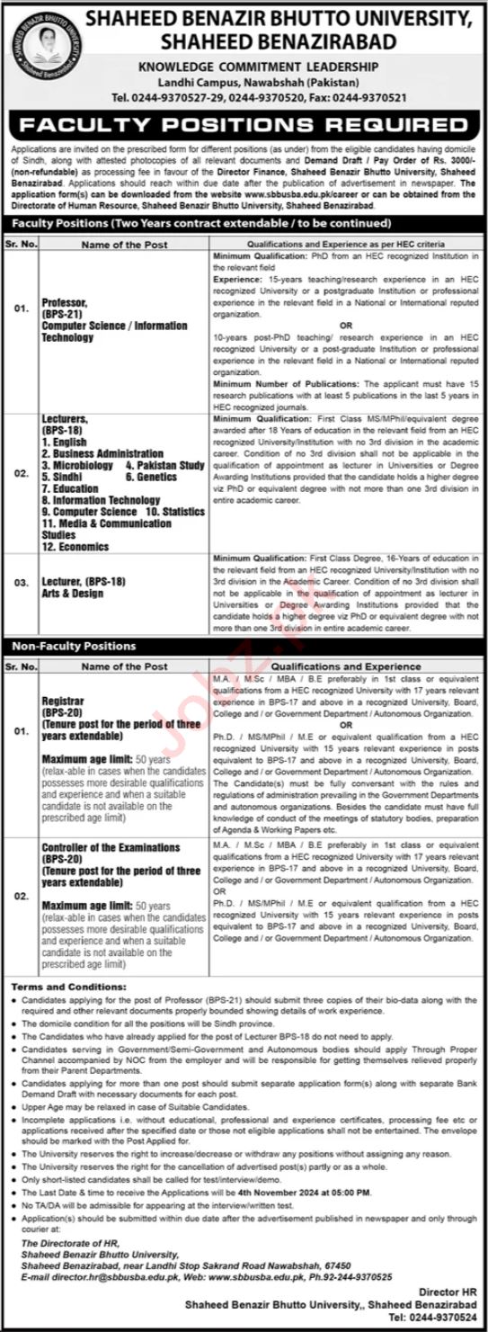 Vacancies in Shaheed Benazir Bhutto University Advertisement October 2024