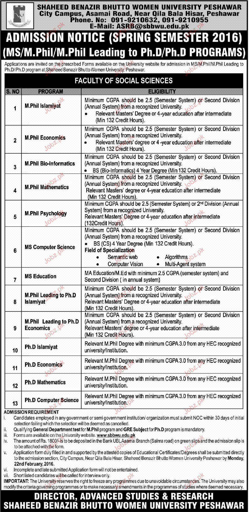 Shaheed Benazir Bhutto Women University Admission in MS / Mphill in Peshawar. Read newspaper ad for exact details.