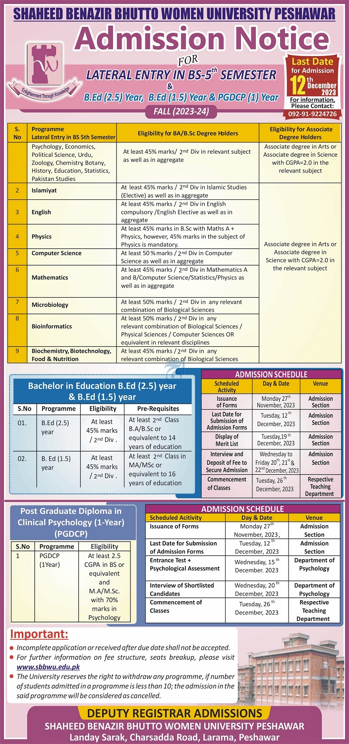 Shaheed Benazir Bhutto Women University Lateral Entry in BS 5th Semester, BS, BEd 2.5 Year, BEd 1.5 Year and 1 Year PGDCP admissions 2023 has been announced. Shaheed Benazir Bhutto Women University Peshawar Khyber Pakhtunkhwa KPK Pakistan welcomes students to apply for admissions in academic year 2023 in Science University. Eligible students for fulfilling criteria for admissions in B.ed, P.G Diploma and BS can enroll as per Government admission policy 2023 till closing date 12 December 2023. Read newspaper ad for exact details.