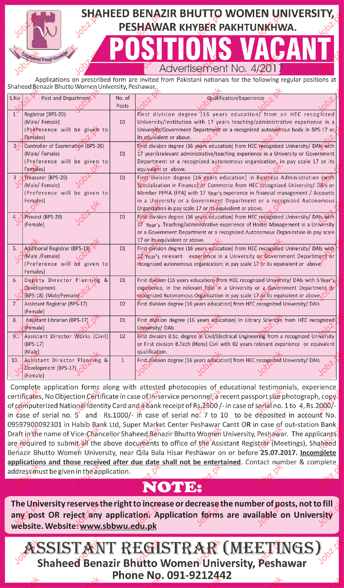 Shaheed Benazir Bhutto Women University Jobs 2017
