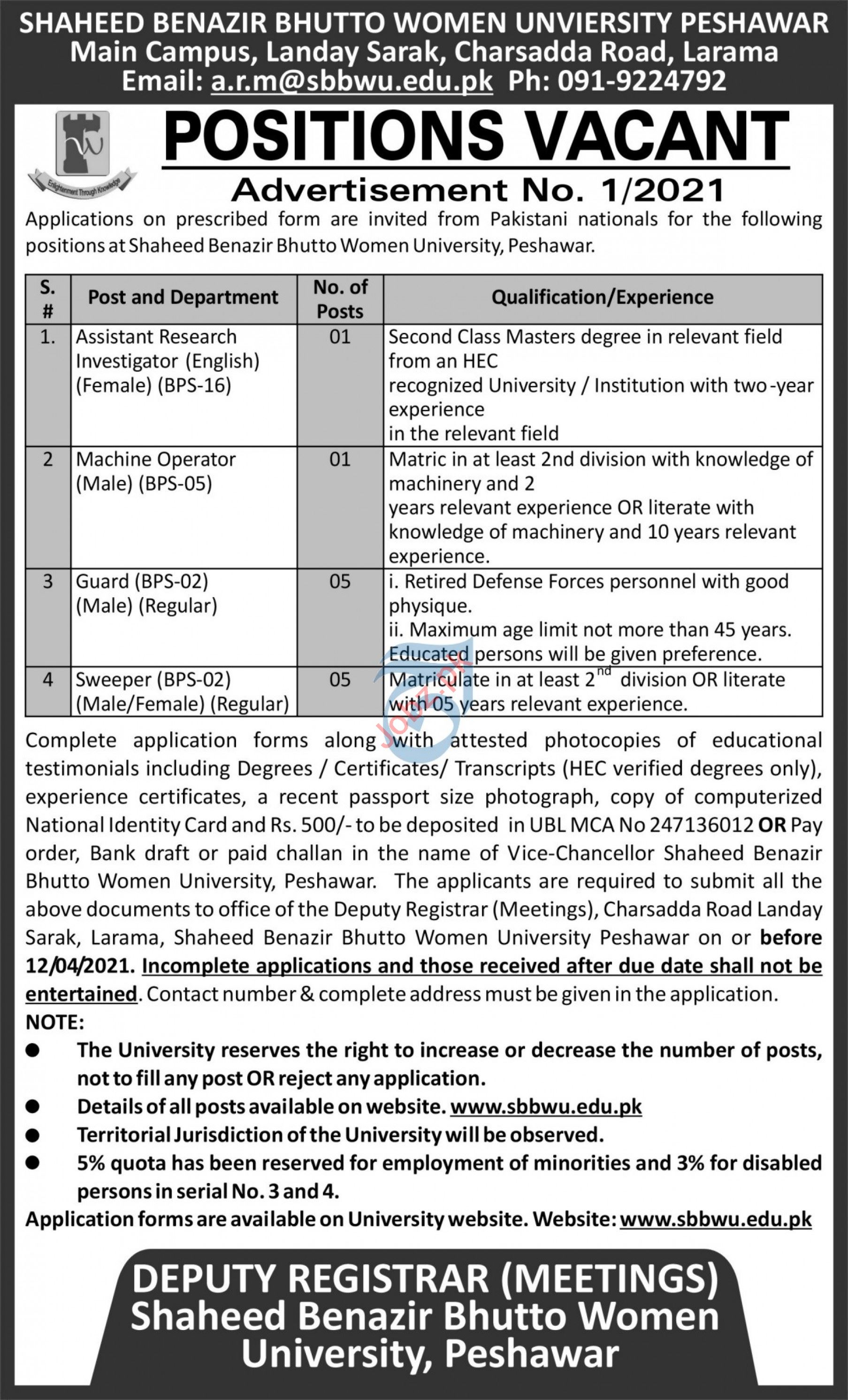 Vacancies in Shaheed Benazir Bhutto Women University Advertisement March 2021