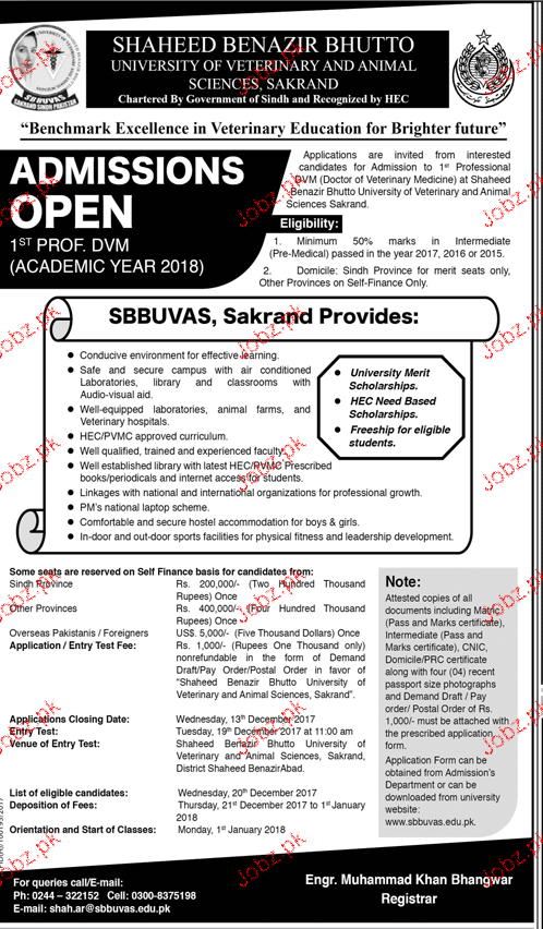 Shaheed Benazir Bhutto Women University of Veterinary and Animal Science Admission in 1s Proof DVM Academic Year 2018 in Skrand. Last date for submission of admission forms is 31 December 2017. Read newspaper ad for exact details.