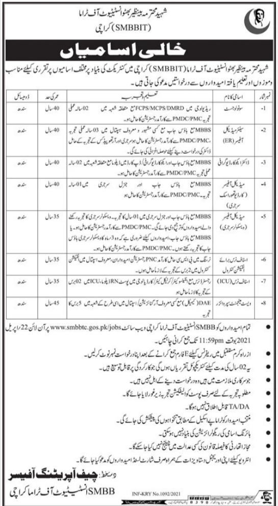 Vacancies in Shaheed Mohtarma Benazir Bhutto Institute of Trauma SMBBIT Advertisement April 2021