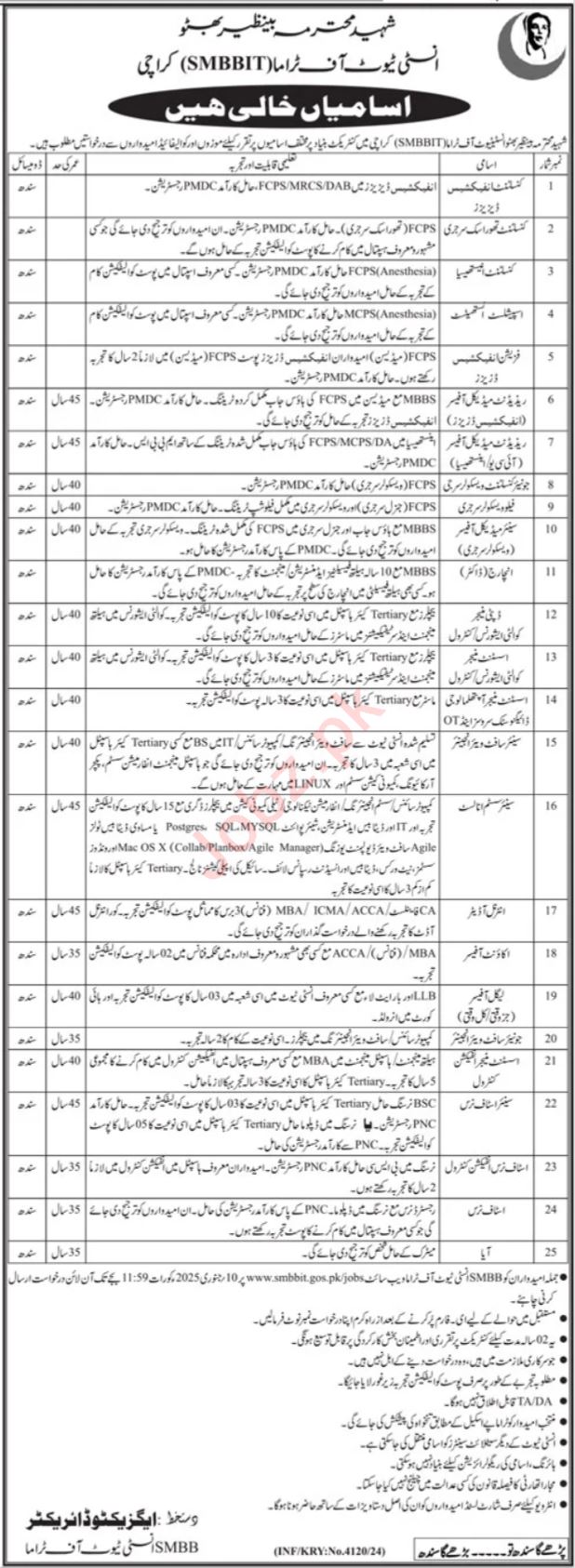 Shaheed Mohtarma Benazir Bhutto Institute of Trauma SMBBIT invites applications for job positions advertised in daily Jang dated 29 December 2024 for following vacancies in Karachi, karachi Sindh Pakistan.