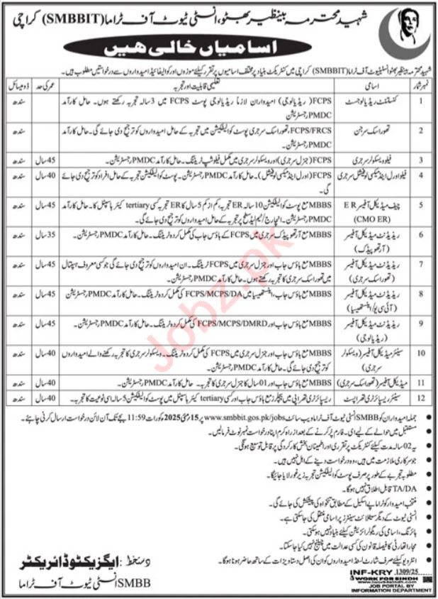 Shaheed Mohtarma Benazir Bhutto Institute of Trauma SMBBIT is looking for candidates for following posts as per job advertisement published in daily Jang Newspaper of April 27, 2025 for location Karachi, karachi Sindh Pakistan: