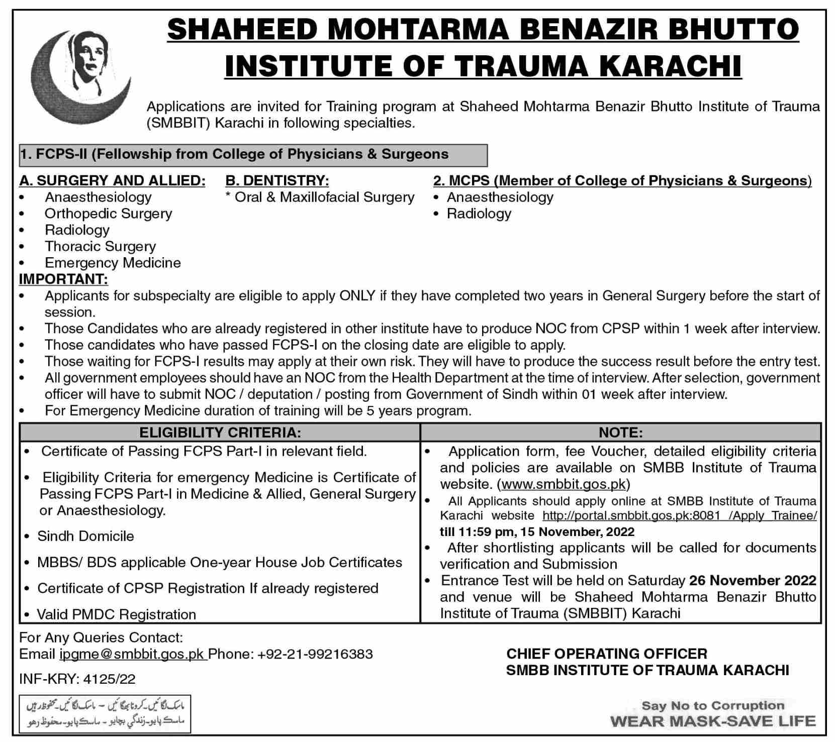 Shaheed Mohtarma Benazir Bhutto Institute of Trauma SMBBIT has announced admissions 2022 for Anaesthesiology, Orthopedic, Radiology, Thoracic Surgery, and Emergency Medicine. Shaheed Mohtarma Benazir Bhutto Institute of Trauma SMBBIT Karachi Sindh Pakistan welcomes students to apply for admission in academic year 2022 in Medical University. Eligible candidates for admissions in Others and P.G Diploma can apply as per Government institute criteria and before closing date 15 November 2022 after reading the advertisement online. Read newspaper ad for exact details.
