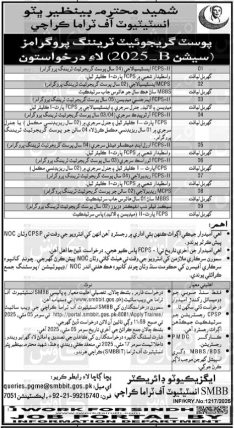 Vacancies in Shaheed Mohtarma Benazir Bhutto Institute of Trauma SMBBIT Advertisement April 2025