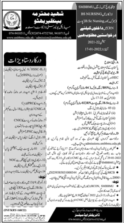 Shaheed Mohtarma Benazir Bhutto Medical University BS Nursing, BSc Nursing, Bs Nursing Post RN, BS Nursing Generic admissions 2022 has been started. Students who want to take admissions in Shaheed Mohtarma Benazir Bhutto Medical University Larkana Sindh Pakistan for academic year 2022 to continue education in Medical Nursing can apply. Eligible candidates for admissions in BSN can apply as per Government institute criteria and before closing date 13 February 2022 after reading advertisement online. Read newspaper ad for exact details.