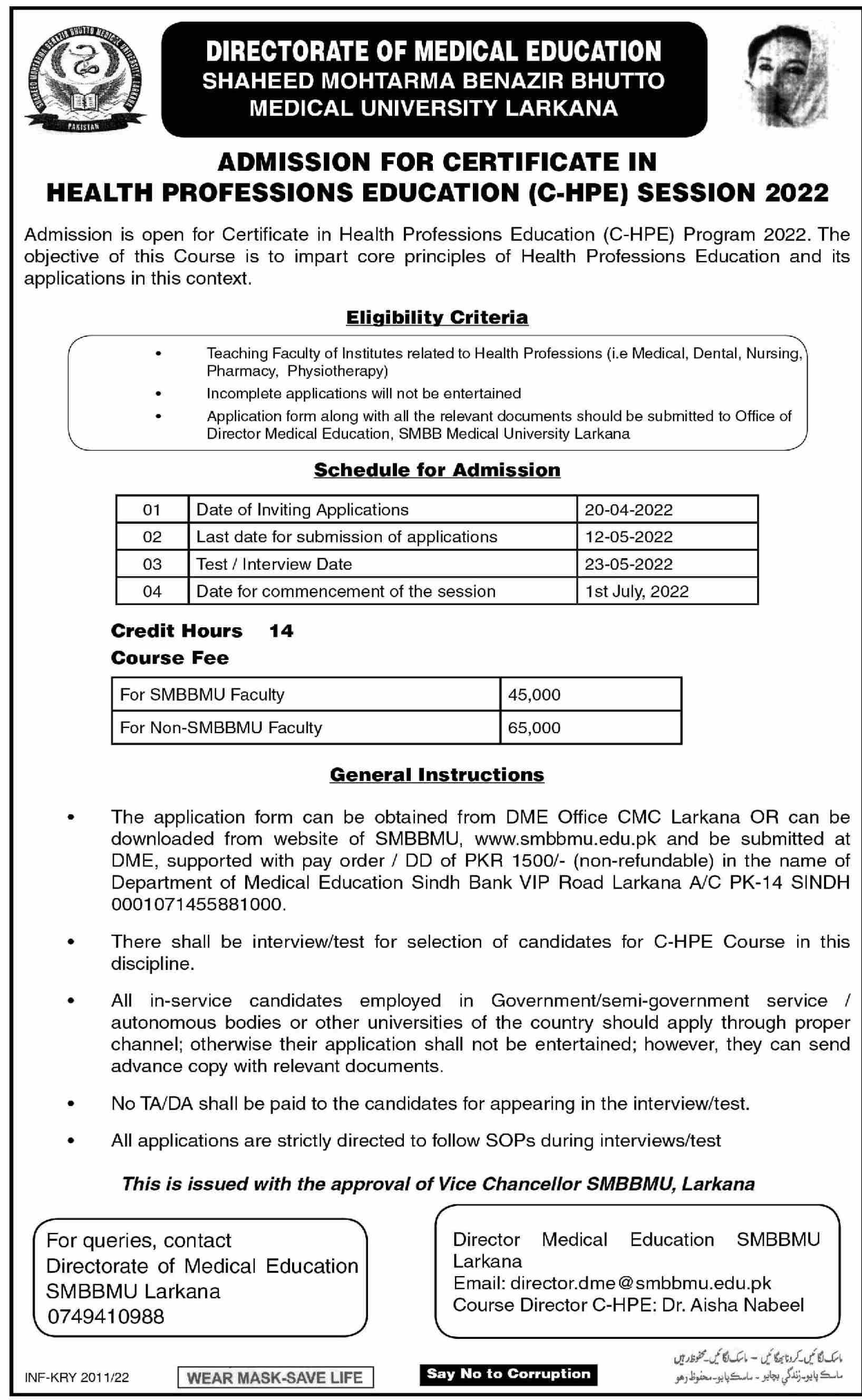 Shaheed Mohtarma Benazir Bhutto Medical University has announced admissions 2022 for C-HPOE, Certificate in Health Professions Education. Students who want to take admissions in Shaheed Mohtarma Benazir Bhutto Medical University Larkana Sindh Pakistan for academic year 2022 to continue education in Hospitality University can apply. Eligible students for fulfilling criteria for admissions in Diploma and Course can enroll as per Government admission policy 2022 till closing date 12 May 2022. Read newspaper ad for exact details.