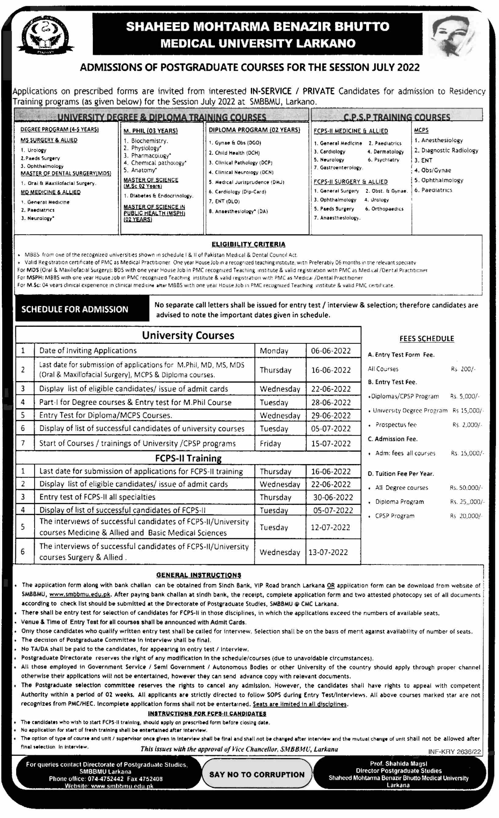 Shaheed Mohtarma Benazir Bhutto Medical University Degree Program, M Phil Program, FCPS Medicine, MCPS, Anesthesiology, Diagnostic Radiology, ENT, OBS, Gynae, Ophthalmology, Paediatrics admissions 2022 has been started. Students who want to take admissions in Shaheed Mohtarma Benazir Bhutto Medical University Larkana Sindh Pakistan for academic year 2022 to continue education in Medical University can apply. Students for admissions in MCPS, Others, Master, FCPS, Mphil and Bachelor can apply for online or campus classes as per Government institute criteria till admission closing date June 16, 2022. Read newspaper ad for exact details.