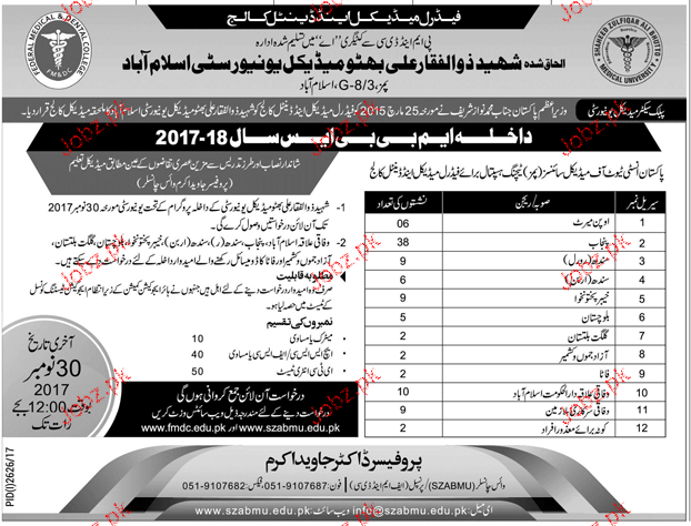 Shaheed Motharma Benazir Bhutto Medical University Admission in MBBS Session 2017-2018 in Islamabad. The Submission of application along with required is November 30, 2017. Read newspaper ad for exact details.