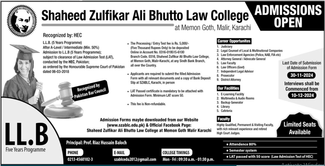 Shaheed Zulfikar Ali Bhutto University of Law SZABUL admissions 2024 for LLB has been announced. Eligible students can apply for academic admissions 2024 in Shaheed Zulfikar Ali Bhutto University of Law SZABUL Karachi Sindh Pakistan for Law College. Students for admissions in LLb can apply for online or campus classes as per Government institute criteria till admission closing date November 29, 2024. Read newspaper ad for exact details.