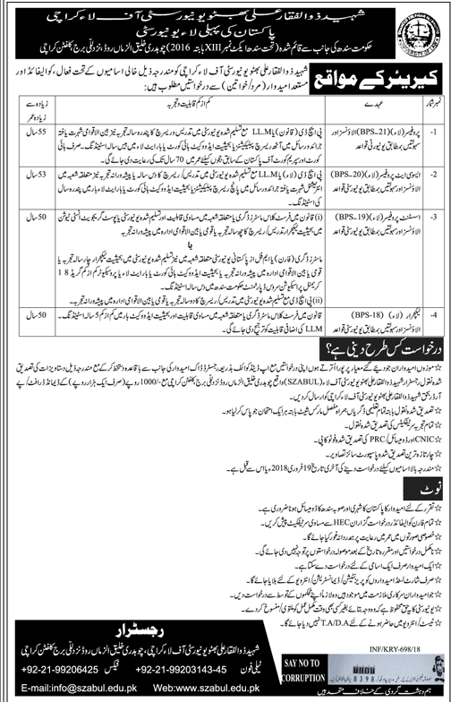 Latest Shaheed Zulfikar Ali Bhutto University of Law SZABUL Teaching Posts Karachi 2025
