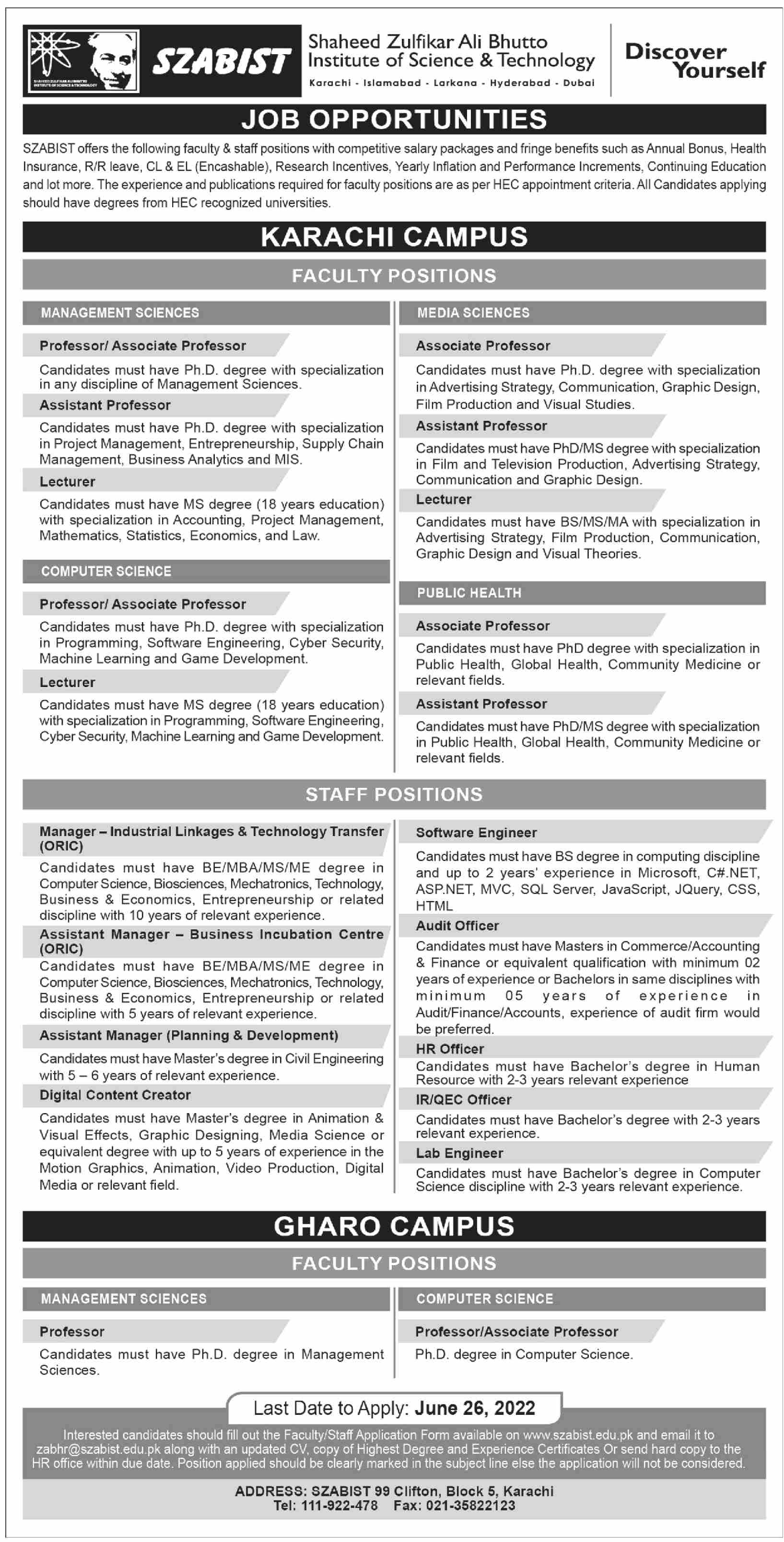 Latest Education jobs and others Government jobs in Shaheed Zulfiqar Ali Bhutto Institute of Technology SZABIST closing date is around June 26, 2022, see exact from ad. Read complete ad online to know how to apply on latest Shaheed Zulfiqar Ali Bhutto Institute of Technology SZABIST job opportunities.