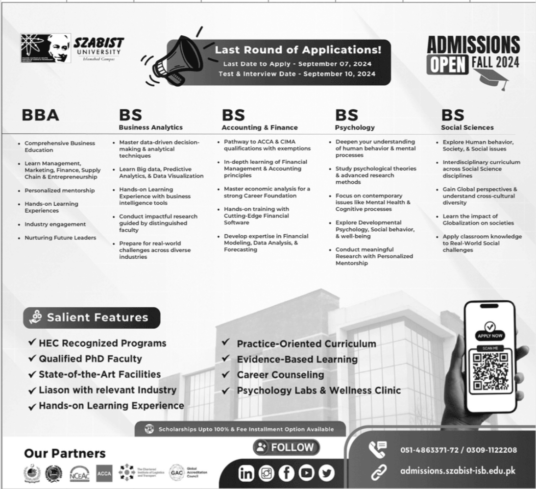 Shaheed Zulfiqar Ali Bhutto Institute of Technology SZABIST admissions 2024 for Business Analytics, Accounting & Finance, Psychology, Social Sciences has been announced. Students can enroll for admissions in Shaheed Zulfiqar Ali Bhutto Institute of Technology SZABIST Islamabad Islamabad Pakistan for academic year 2024 to continue campus based or online education in Teaching University. Eligible candidates for admissions in BS and BBA can apply as per Government institute criteria and before closing date 20 September 2024 after reading advertisement online. Read newspaper ad for exact details.