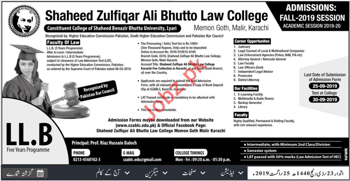 Shaheed zulfiqar Ali Bhutto Law College Admissions 2019