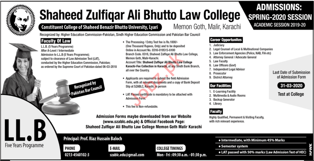 Shaheed Zulfiqar Ali Bhutto Law College recognized by Higher Education Commission HEC is offering admissions in Bachelor of Laws LLB 5 Years Degree Programme. Read newspaper ad for exact details.