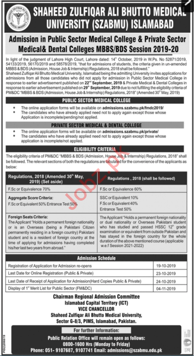 Shaheed Zulfiqar Ali Bhutto Medical University SZABMU has announced admissions in Public Sector Medical College & Private Sector Medical & Dental Colleges MBBS, BDS Session 2019-20 in Islamabad. Read newspaper ad for exact details.