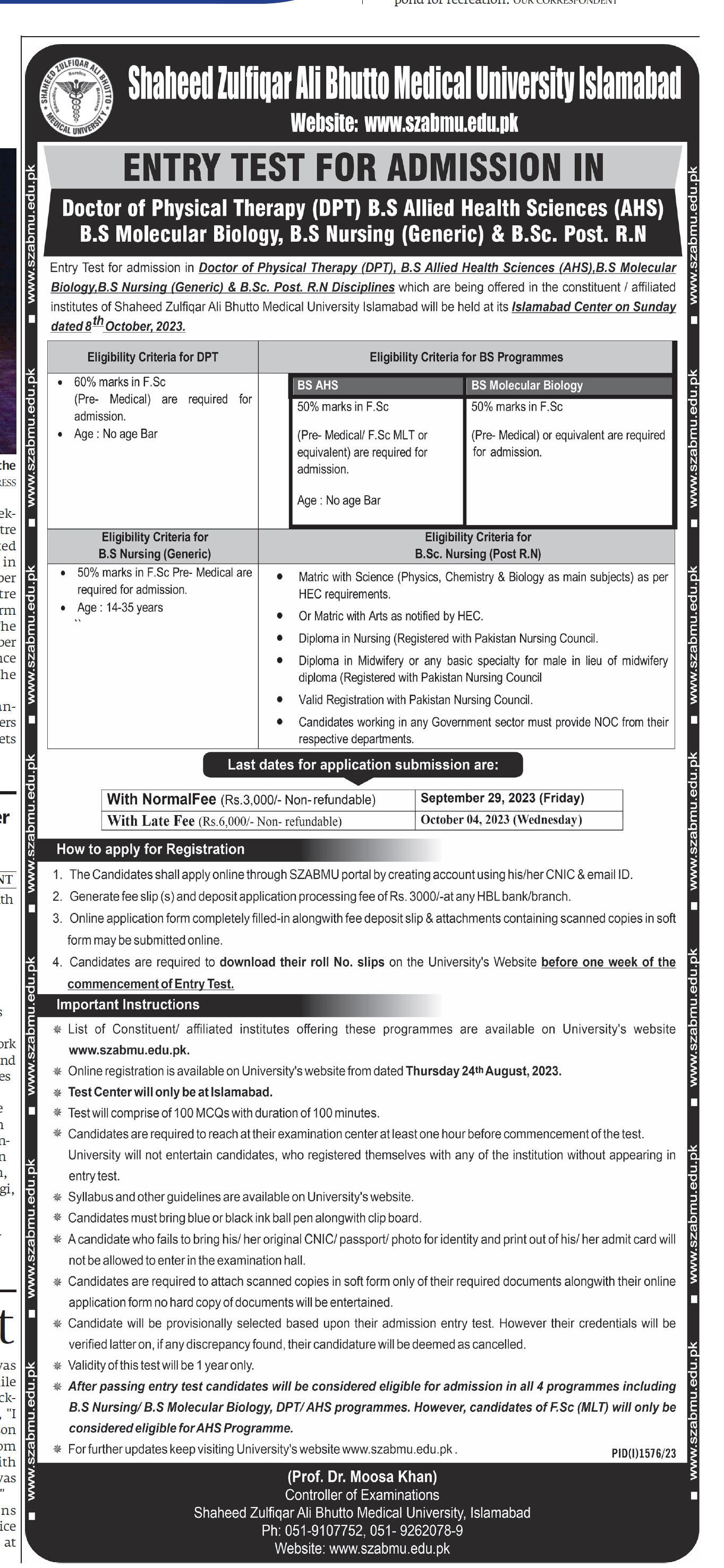 Shaheed Zulfiqar Ali Bhutto Medical University SZABMU has announced admissions 2023 for Doctor of Physical Therapy DPT, BA Allied Health Science, BS Molecular Biology, BS Nursing Generic,, BSc Post RN. Eligible students who qualify as per admission criteria in Shaheed Zulfiqar Ali Bhutto Medical University SZABMU Islamabad Islamabad Pakistan can apply in Science University for academic year 2023. Students for admissions in DPT and BS & criteria can apply as per Government institute admission policy 2023 before closing date September 29, 2023 as per advertisement. Read newspaper ad for exact details.